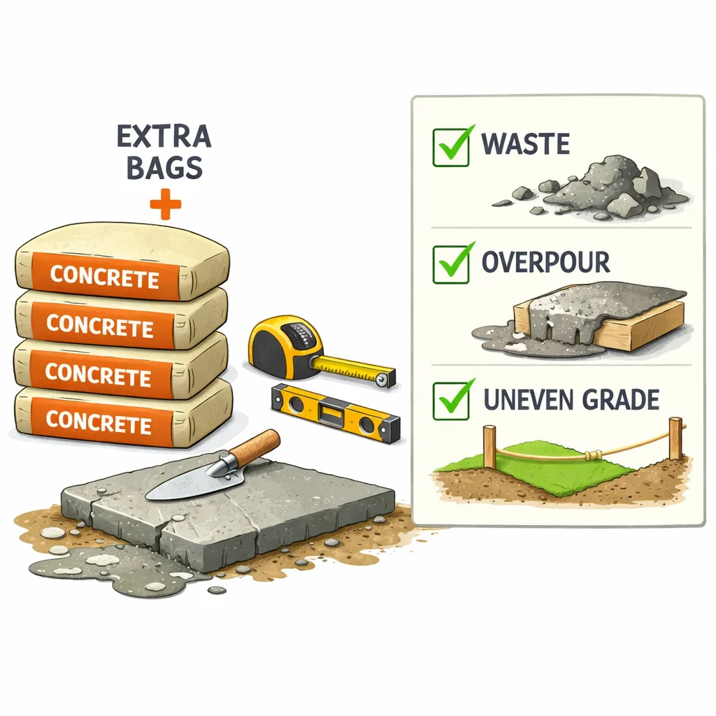 Waste, overpour, uneven grade, and product yield can all affect the final number of bags you need, so use the concrete bag calculator as a planning estimate rather than a perfect purchase total.