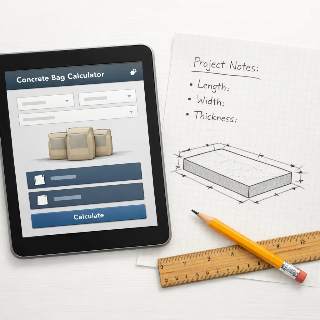 Use this concrete bag calculator as a planning tool, then verify the yield printed on the product bag, add extra for waste, and compare bag count against project size before you buy materials.